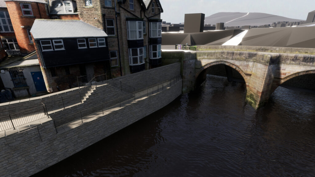 This is an artist’s impression of the finished wall. Note that work is now completed and has successfully protected the Town Centre from the severe flooding of the Derwent in autumn 2023.