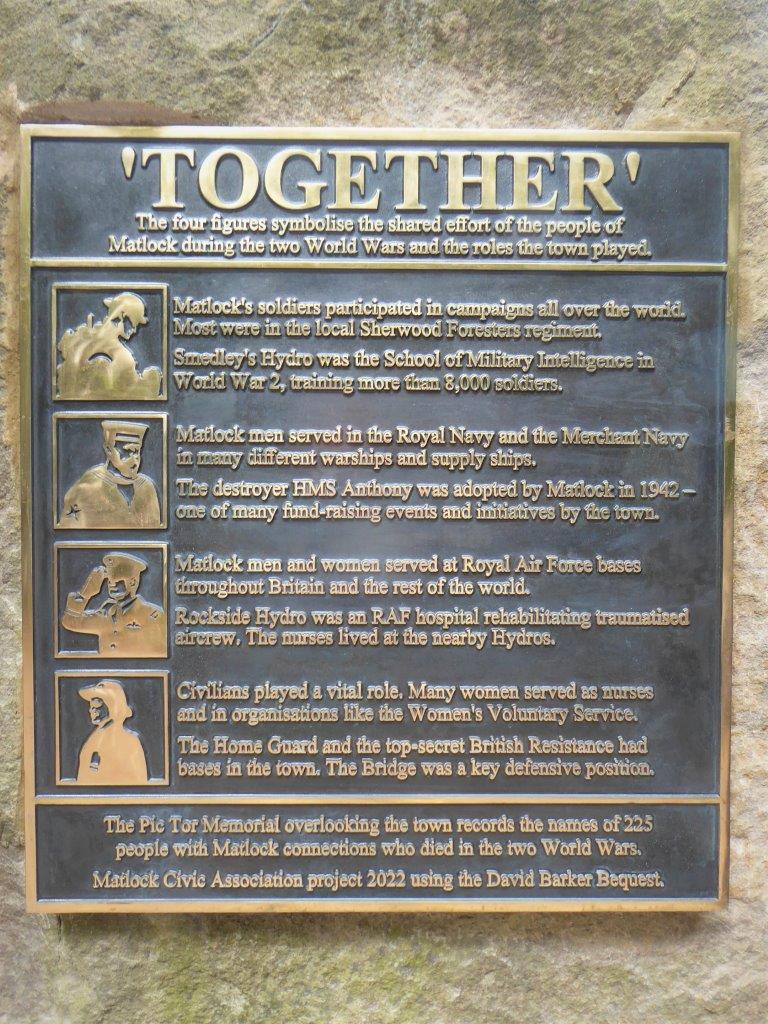 A new piece of artwork entitled ‘Together’ has been added to the Memorial Stone at Park Head in the centre of Matlock. It remembers the spirit of the town as reflected in the many different contributions of local people during the conflicts of the last century. It recalls the vital spirit of Togetherness that saw the town pull together during difficult times. It was made possible by a bequest in the will of David Barker. David was a long serving Councillor on both Derbyshire Dales District Council and Matlock Town Council. He was three times the Mayor of Matlock and a staunch supporter of The Royal British Legion and The Fellowship of The Services. He was a founder member of Matlock Civic Association. The idea of ‘Together’ was developed in close co-operation between these five organisations and is a fitting first use of David’s bequest.